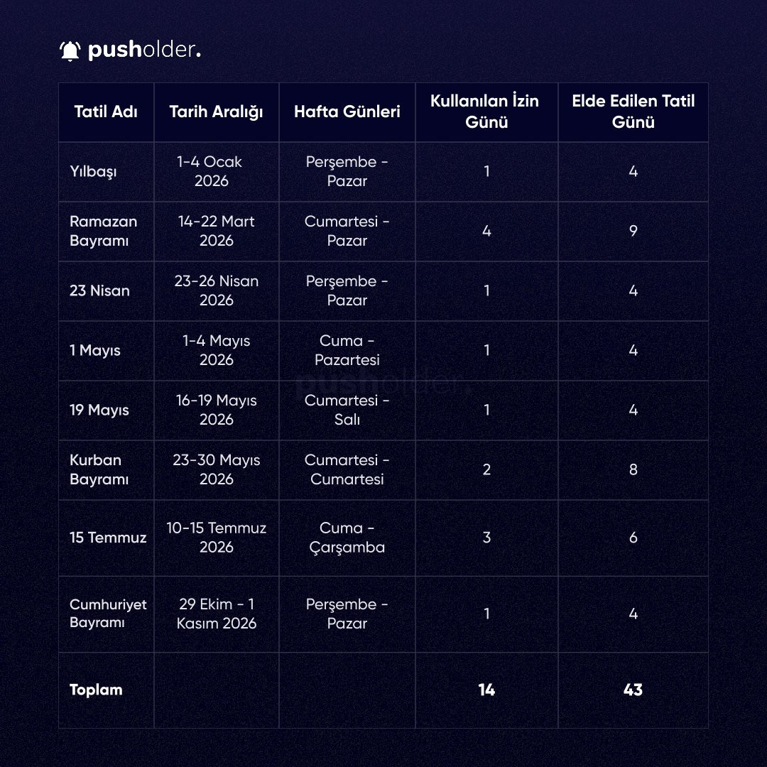 Yılın başlangıcında Perşembe gününe denk gelen Yılbaşı tatilinde sadece 1 gün izin alarak 4 günlük bir kaçamak yapmak mümkün olacak. Bunu takiben, Mart ayına sarkan Ramazan Bayramı'nda (14-22 Mart) 4 gün izin kullanılarak toplam 9 gün kesintisiz tatil yapılabilirken; hemen ardından Nisan ayındaki 23 Nisan Ulusal Egemenlik ve Çocuk Bayramı Perşembe'ye, 1 Mayıs Emek ve Dayanışma Günü ise Cuma'ya denk gelerek yine minimum izinle 4'er günlük iki ayrı tatil imkânı yaratıyor. Mayıs ayında ise Cumartesi başlayan Kurban Bayramı (23-30 Mayıs) sadece 2 gün ek izinle 8 güne uzatılabilecek.