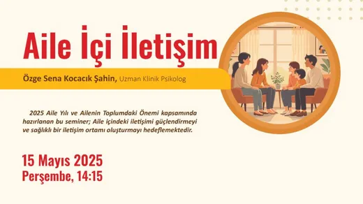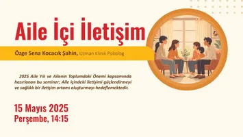 15 Mayıs Perşembe günü saat 14.15’te, Uzman Klinik Psikolog Özge Sena Kocacık Şahin tarafından “Aile İçi İletişim” konulu bir seminer düzenlenecek. Seminerde, aile bireyleri arasında sağlıklı iletişim kurmanın yolları hem teorik hem de pratik bilgilerle ele alınacak. Katılımcılara iletişim becerilerini geliştirmelerine yardımcı olacak stratejiler sunulacak.