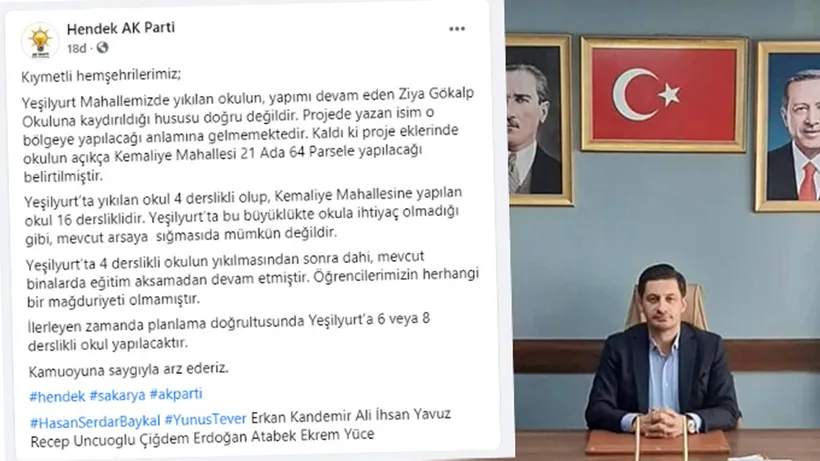 Ak Parti İlçe Başkanı Hasan Serdar Baykal’ın fotoğrafı ile birlikte Ak Parti Hendek İlçe Teşkilatı sosyal medya sayfasından yapılan açıklamada; "Kıymetli hemşerilerimiz; Yeşilyurt Mahallemizde yıkılan okulun, yapımı devam eden Ziya Gökalp Okuluna kaydırıldığı hususu doğru değildir. Projede yazan isim o bölgeye yapılacağı anlamına gelmemektedir. Kaldı ki proje eklerinde Okulun açıkça Kemaliye Mahallesi 21 Ada 64 Parsele yapılacağı belirtilmiştir. Yeşilyurt’ta yıkılan Okul 4 derslikli olup, Kemaliye Mahallesine yapılan okul 16 dersliklidir. Yeşilyurt’ta bu büyüklükte Okula ihtiyaç olmadığı gibi, mevcut arsaya sığması da mümkün değildir. Yeşilyurt’ta 4 derslikli Okulun yıkılmasından sonra dahi, mevcut binalarda eğitim aksamadan devam etmiştir. Öğrencilerimizin herhangi bir mağduriyeti olmamıştır. İlerleyen zamanlarda planlama doğrultusunda Yeşilyurt’a 6 veya 8 derslikli Okul yapılacaktır. Kamuoyuna saygıyla arz ederiz.