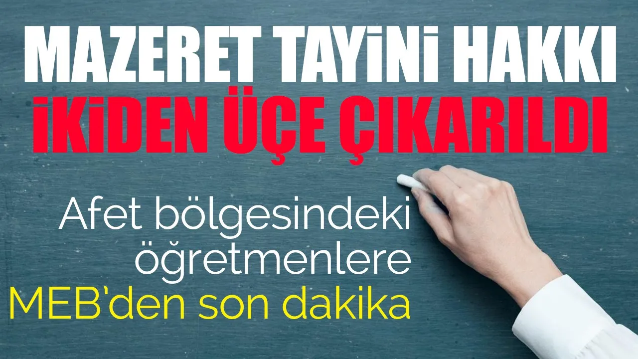 Alınan karar ile öğretmenlerin yılda 2 kez yaptığı mazeret tayini hakkı, bu yıl deprem nedeniyle3'e çıkarıldı.