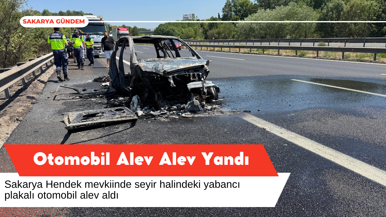 Sakarya Hendek mevkiinde seyir halindeyken alev alan yabancı plakalı otomobil, itfaiye ekiplerinin müdahalesiyle söndürüldü. Yangında araç tamamen kullanılamaz hale gelirken, trafik kısa süre tek şeritten kontrollü olarak sağlandı.