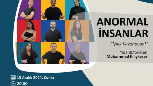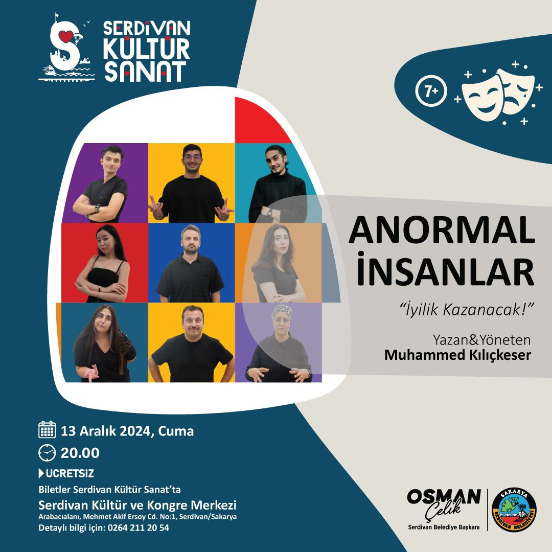 Serdivan Belediyesi Kültür Sanat, tiyatroseverleri keyifli bir akşama davet ediyor. "Anormal İnsanlar" adlı tiyatro oyunu, 13 Aralık 2024 Cuma günü saat 20.00'de Serdivan Belediyesi Kültür ve Kongre Merkezi'nde sahnelenecek. Muhammed Kılıçkeser’in yazıp yönettiği ve yönettiği bu anlamlı oyun, izleyicilere “İyilik Kazanacak!” mesajını aktarmayı hedefliyor.