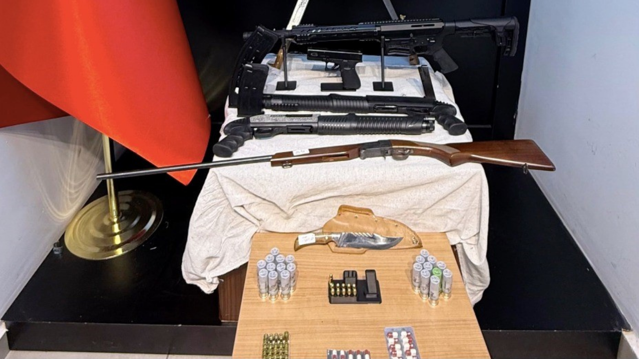 Operasyonda 4 adet pompalı tüfek, 1 adet ruhsatsız tabanca, 3 adet kılıç, 45 adet tabanca fişeği, 17 adet tüfek kartuşu ile 60 adet uyuşturucu hap ele geçirildi.