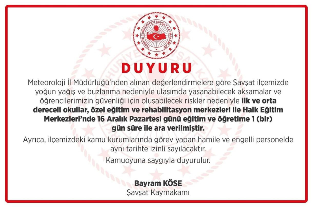 "İlçemizde devam eden olumsuz hava koşulları sonucunda ulaşımda yaşanabilecek aksamalar nedeniyle ilk ve orta dereceli okullar ile halk eğitim merkezinde eğitim ve öğretime 1 gün süreyle ara verilmiştir. Ayrıca kamu kurumlarında görev yapan hamile ve engelli personel de aynı tarihte idari izinli sayılacaktır.”