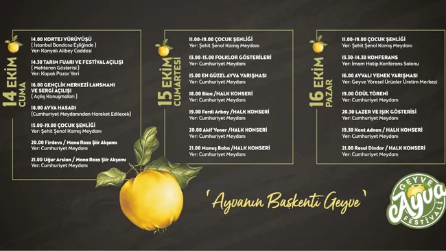 14 – 15 – 16 Ekim tarihlerinde gerçekleşecek Geyve Ayva Festivali’nin programı şu şekilde: