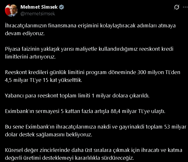 Hazine ve Maliye Bakanı Mehmet Şimşek, sosyal medya üzerinden yaptığı açıklamada ihracatçıların finansmana erişimini kolaylaştıracak yeni adımları duyurdu. Şimşek, piyasa faizinin yaklaşık yarısı maliyetle kullandırılan reeskont kredi limitlerinin artırıldığını belirtti. Bu kapsamda, reeskont kredilerinin günlük limiti program döneminde 300 milyon TL'den 4,5 milyar TL'ye (15 kat) yükseltildi. Ayrıca Eximbank'ın sermayesi 5 kattan fazla artışla 88,4 milyar TL'ye ulaştı.