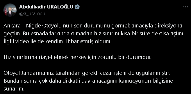 Uraloğlu, paylaşımında otoyolun son durumunu görmek için araç kullandığını belirterek, “Bu esnada farkında olmadan hız sınırını kısa süreli de olsa aştım. İlgili video ile de kendimi ihbar etmiş oldum. Hız sınırlarına riayet etmek herkes için zorunlu bir durumdur. Otoyol Jandarmamız tarafından gerekli cezai işlem uygulanmıştır. Bundan sonra çok daha dikkatli davranacağımı kamuoyunun bilgisine sunarım” ifadelerini kullandı.