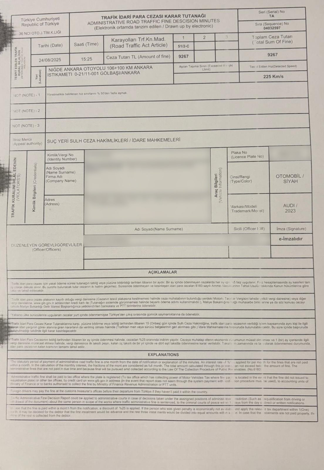 Ulaştırma Bakanı Abdulkadir Uraloğlu, Ankara-Niğde Otoyolu’nda hız sınırını aştığını itiraf ederek kendini ihbar etti. 223 km hız yaptığı belirlenen Uraloğlu’na 9.267 TL ceza uygulandı.