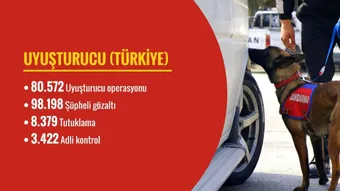 İçişleri Bakanı Ali Yerlikaya sosyal medya hesabından “Son 120 günde 80 bin 572 uyuşturucuyla mücadelede operasyonu düzenlendi” açıklamasında bulundu.