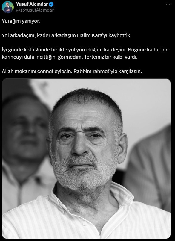 Yusuf Alemdar ile yıllar boyunca süregelen dostluğu ile bilinen Halim Kara’nın ani kaybı, sadece ailesini değil, Sakarya halkını da derinden etkiledi. Başkan Alemdar’ın bu acı kayıpla ilgili olarak, "Kadim dostumu kaybetmenin derin hüznünü yaşıyorum" şeklinde bir açıklama yaptı.