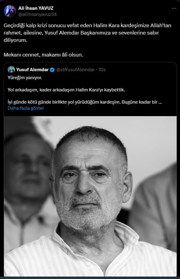 Ali İhsan Yavuz Başkan'dan da Taziye Mesajı Gecikmedi Sosyal medya hesabından üzüntüsünü dile getiren Yavuz ''Geçirdiği kalp krizi sonucu vefat eden Halim Kara kardeşimize Allah'tan rahmet, ailesine, Yusuf Alemdar Başkanımıza ve sevenlerine sabır diliyorum. Mekanı cennet, makamı âli olsun.'' cümleleriyle başsağlığı diledi.
