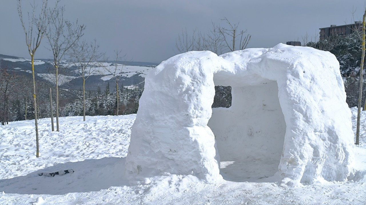 Kocaeli'nin yüksek kesimlerinde etkili olan kar yağışı ile birlikte tatili fırsata çeviren üniversite öğrencileri, kampüs bölgesinde 10 saat süren çalışmayla iglo ev inşa etti. Eğlenceyi de ihmal etmeyen öğrenciler, tamamladıkları iglonun içinde saz çalıp türkü söyleyerek unutulmaz saatler geçirdi. İgloyu gören diğer öğrenciler de eğlenceli etkinliğe katılarak unutulmaz anlara dahil oldu. Öğrencilerin iglo ev çalışması sosyal medyada büyük ilgi gördü.