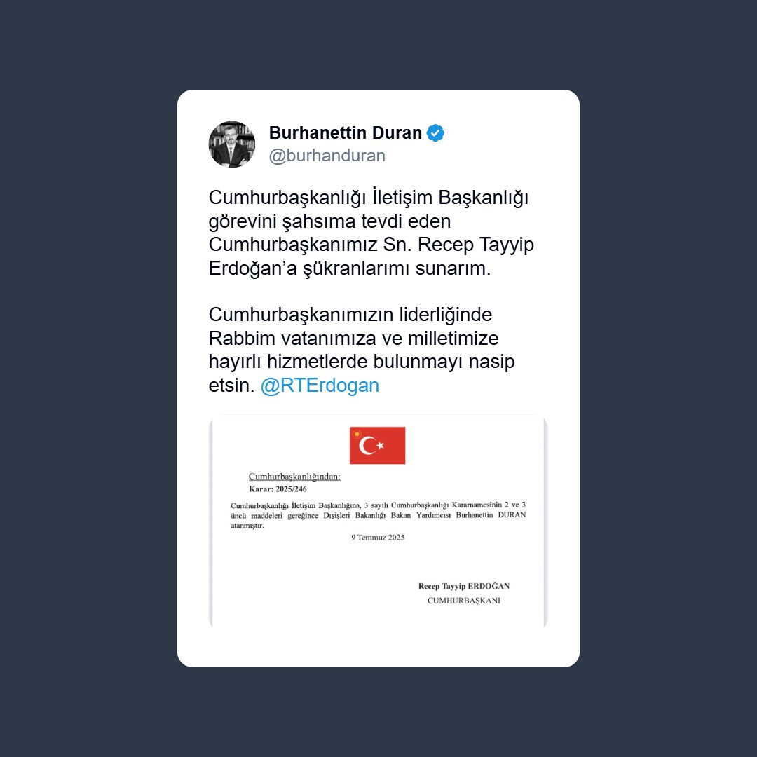 Cumhurbaşkanlığı İletişim Başkanlığı'na yeni atama gerçekleşti. Cumhurbaşkanı Recep Tayyip Erdoğan'ın imzasıyla Resmî Gazete’de yayımlanan karara göre, görevi Fahrettin Altun’dan devralan isim Prof. Dr. Burhanettin Duran oldu. Atama, 8 Temmuz 2025 tarihli ve 32596 sayılı Resmî Gazete’de yayımlanan kararname ile yürürlüğe girdi. Duran, böylece İletişim Başkanlığı görevine getirilen ikinci isim oldu.