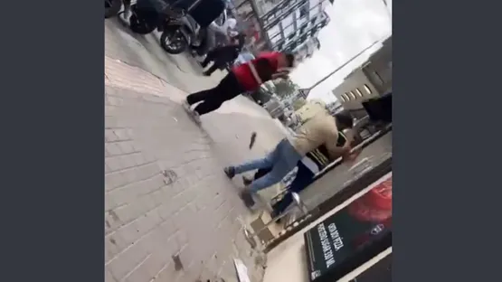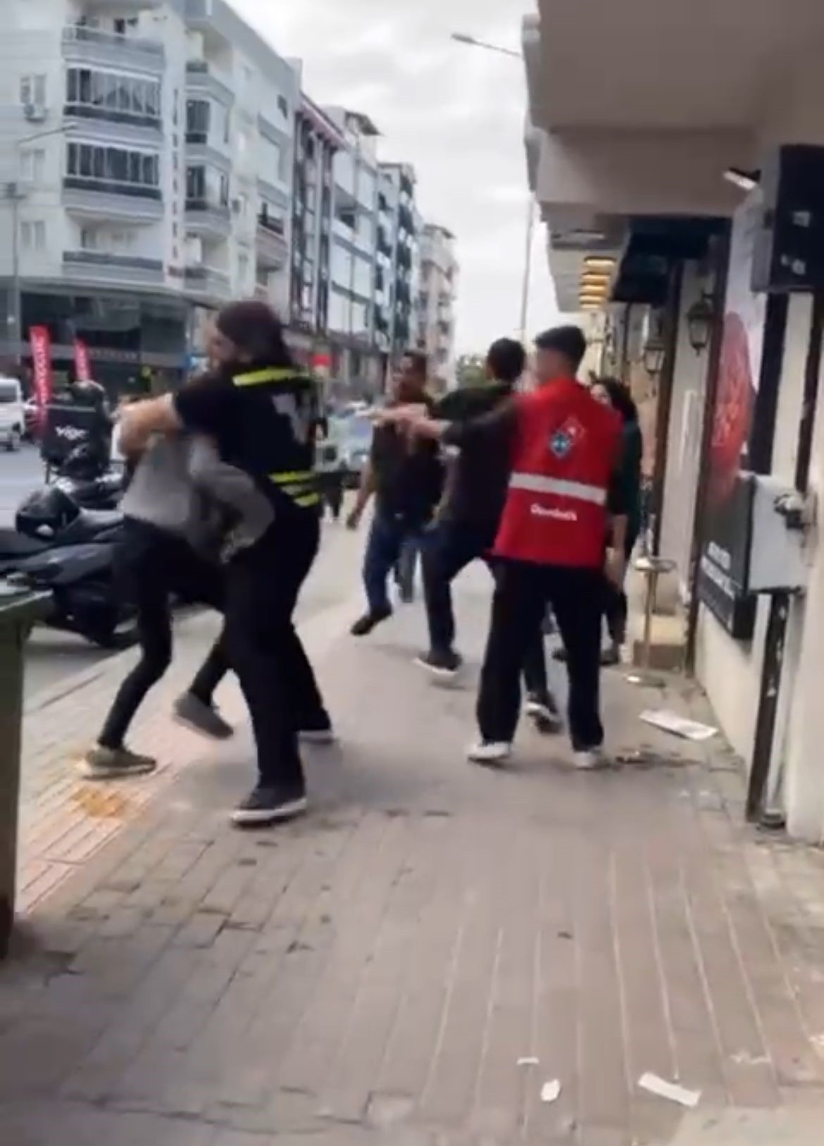 Bursa'da iki kurye arasında çıkan sözlü tartışma kavgaya döndü. Tarafların birbirlerine sopa ve yumruklarla vurduğu anlar kameraya saniye saniye yansıdı.