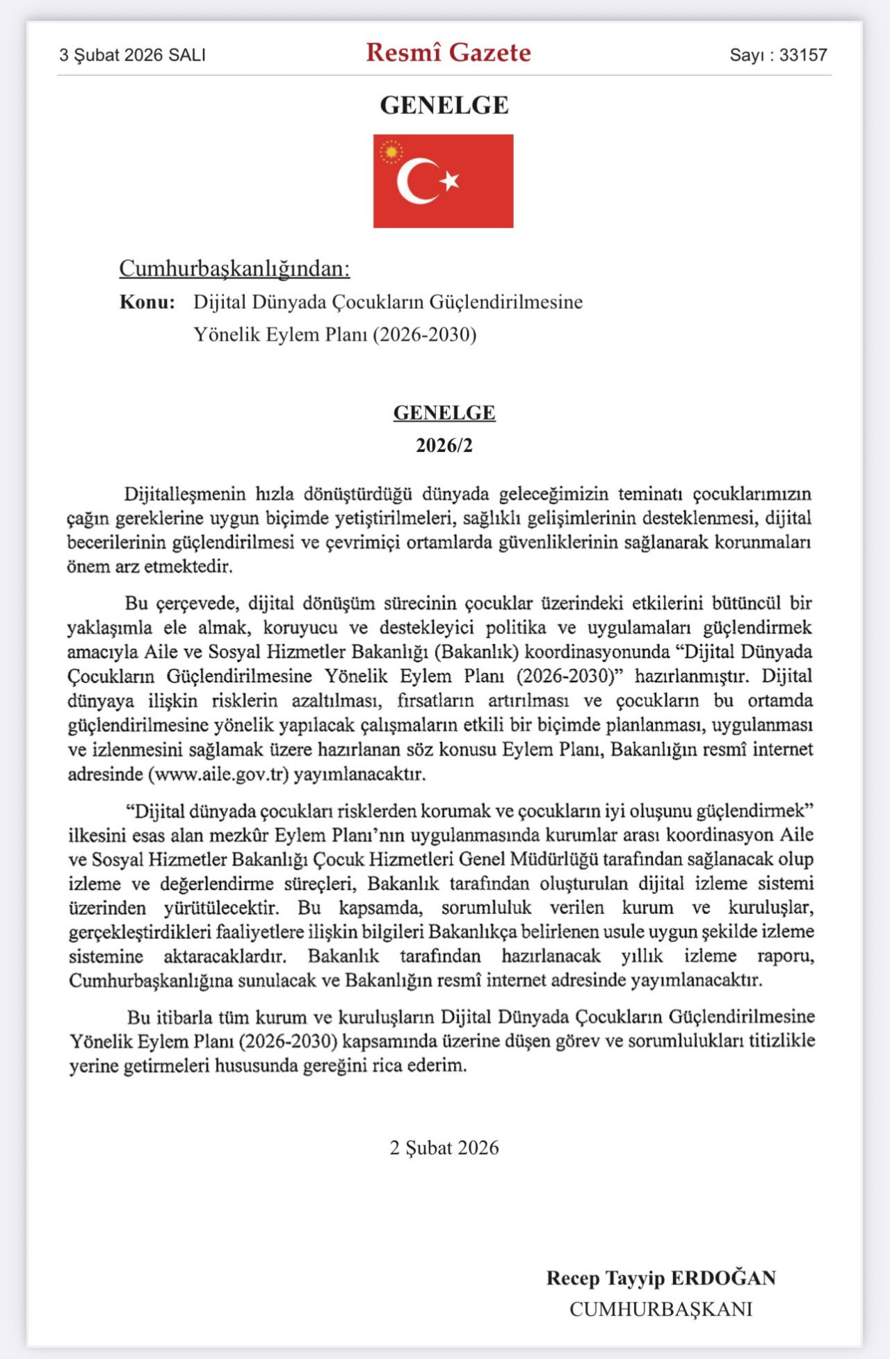 Cumhurbaşkanı Recep Tayyip Erdoğan’ın imzasıyla yayımlanan genelgeyle, çocukların dijital ortamdaki güvenliğini sağlamak ve dijital becerilerini geliştirmek amacıyla hazırlanan 2026-2030 dönemi eylem planı yürürlüğe girdi.