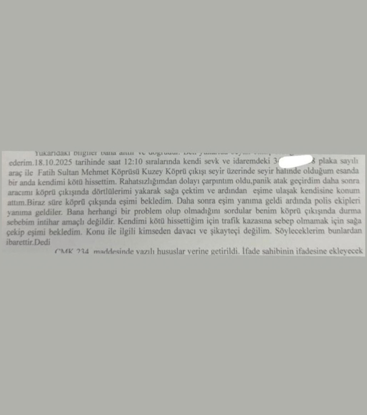 “Köprü çıkışında panik atak geçirdim. Dörtlüleri yakıp Engin’i aradım. Köprüde durma amacım intihar değildi. Kazaya sebebiyet vermek istememiştim.”