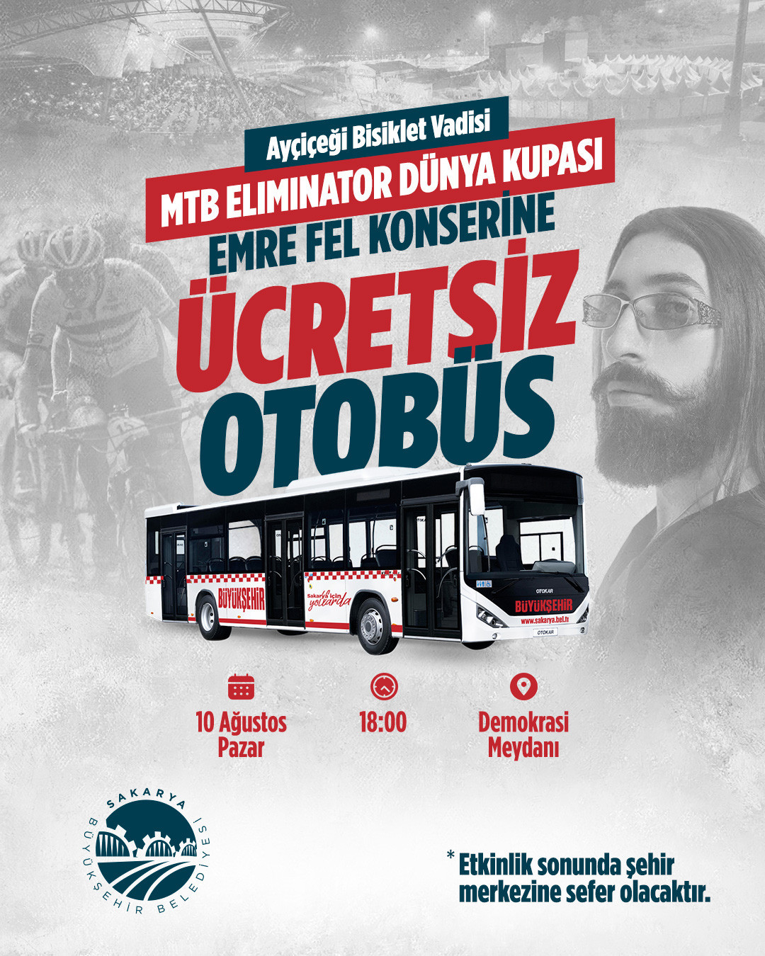 Sakarya Büyükşehir Belediyesi, 10 Ağustos Pazar günü Ayçiçeği Bisiklet Vadisi’nde düzenlenecek MTB Eliminator Dünya Kupası ve Emre Fel konseri için ücretsiz ulaşım imkânı sunacak. Saat 18.00’da 15 Temmuz Demokrasi Meydanı’ndan (Kent Meydanı) hareket edecek otobüsler, vatandaşları yarış alanına ulaştıracak.