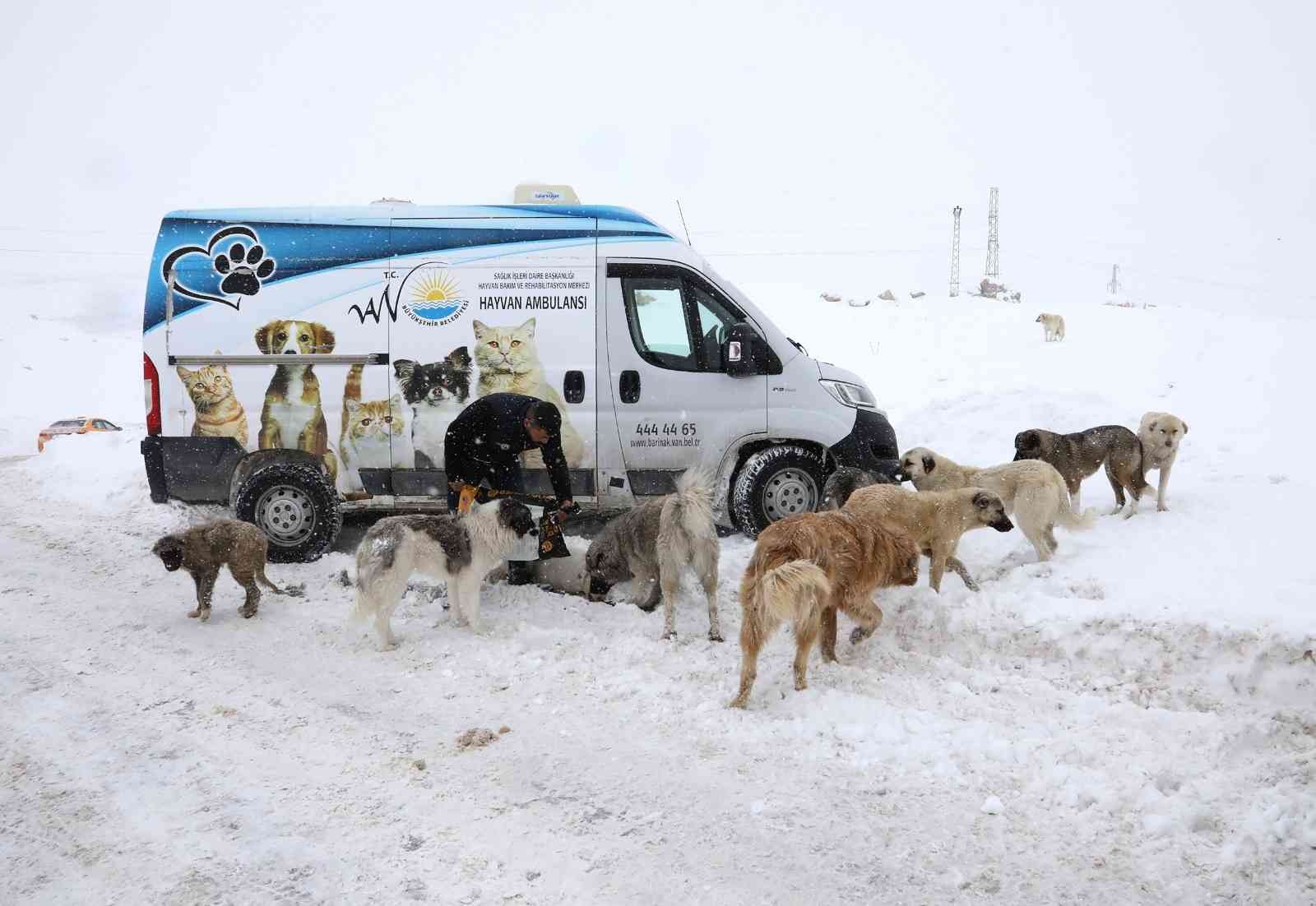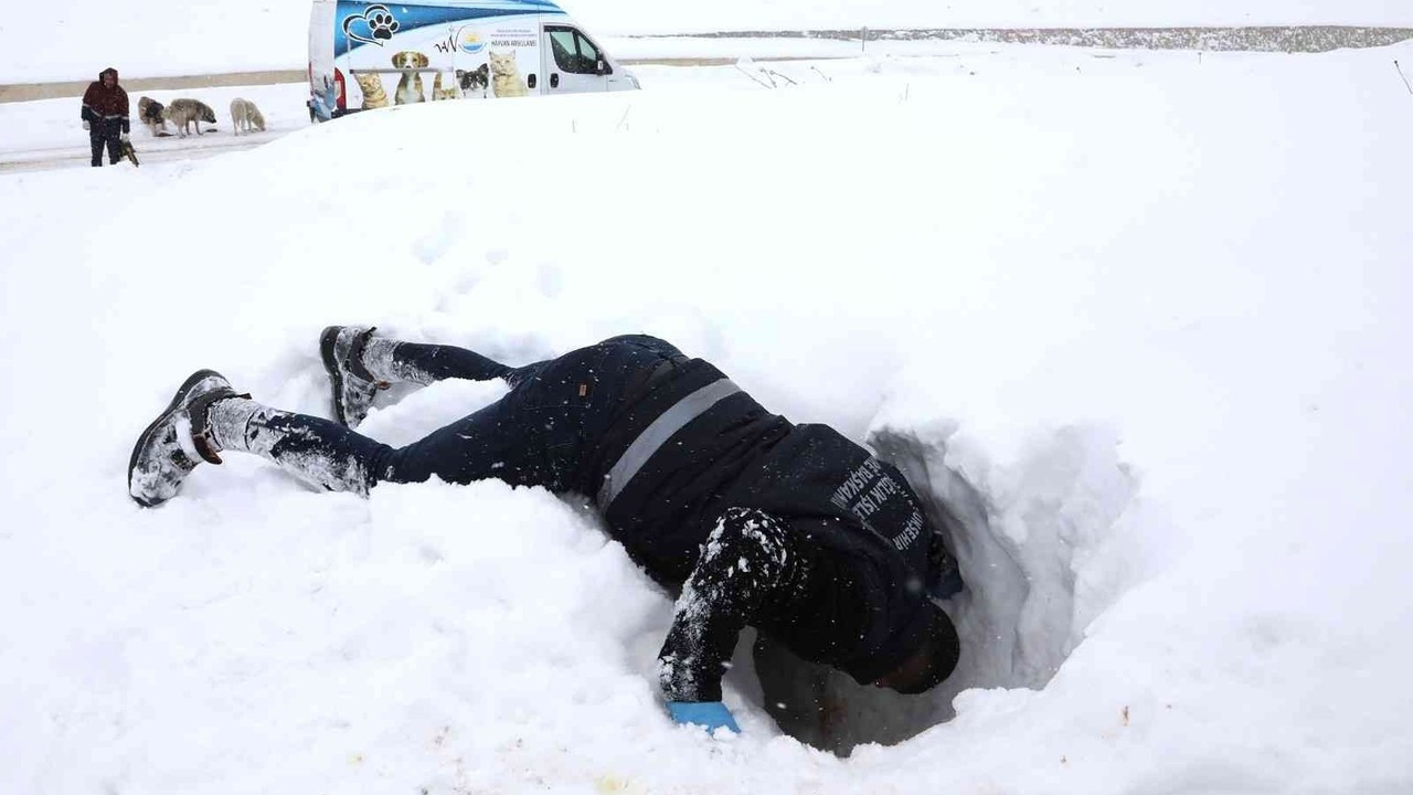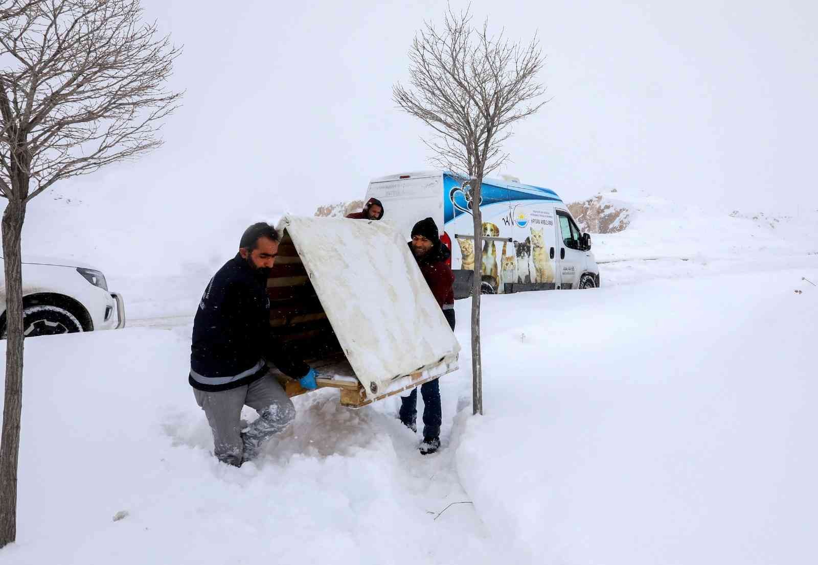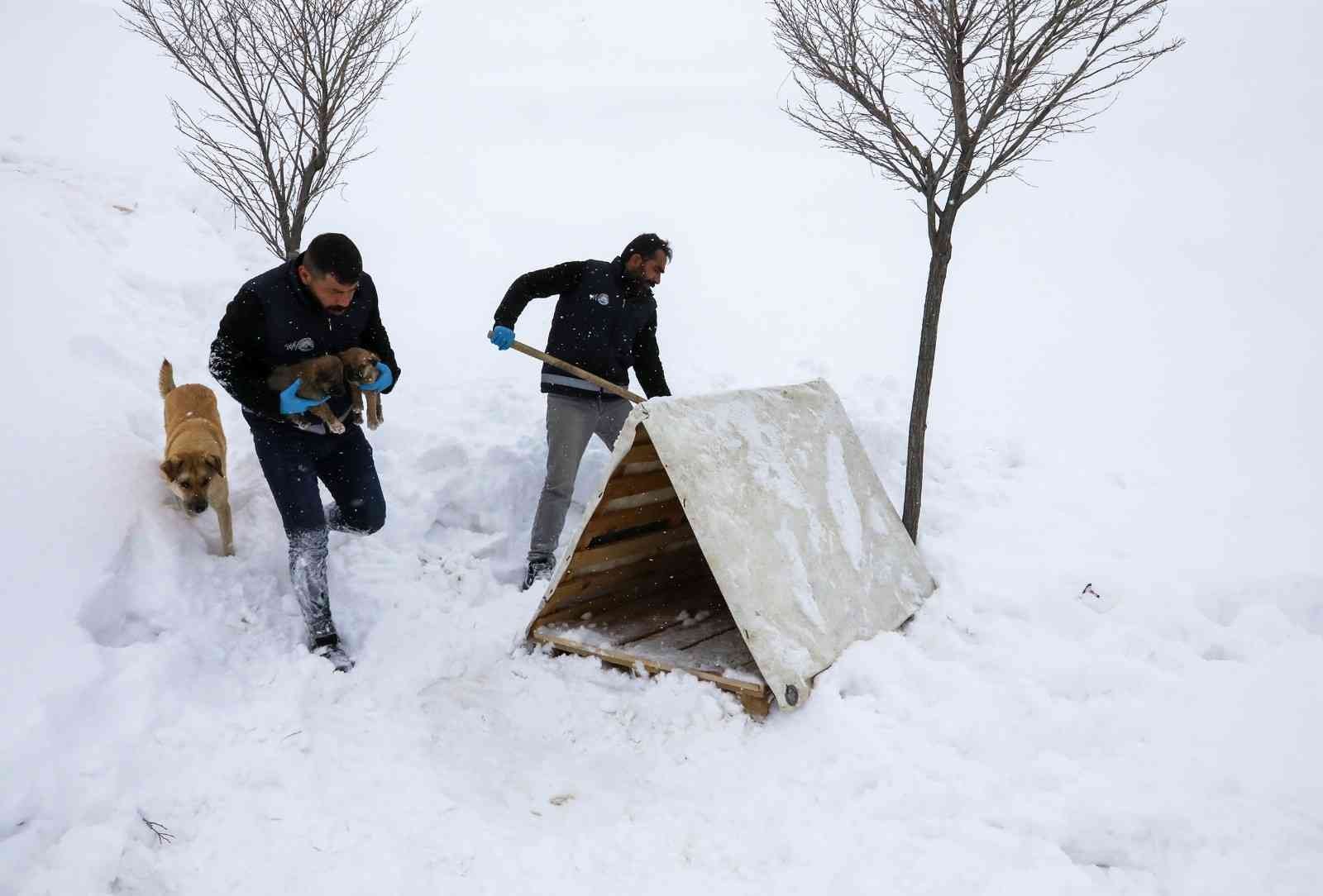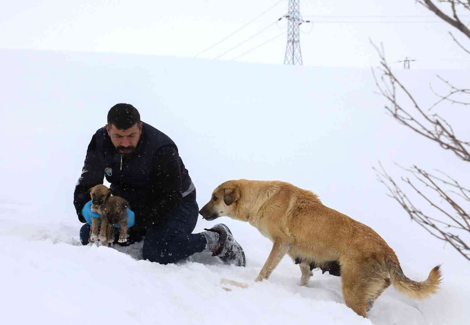 Van Büyükşehir Belediyesi kentte etkili olan yoğun kar yağışı ve soğuk havada yiyecek bulmakta zorlanan hayvanlar için besleme çalışmalarını sürdürüyor. Hayvanların soğuk ve yağışlı havadan etkilenmemesi için çalışan Sağlık İşleri Daire Başkanlığı personelleri, mama çalışmalarının yanında yavru köpeklerin olduğu noktalara kulübe de kuruyor. Özalp yolu üzerinde bulunan dağlık alanda sokak hayvanları ile yabani hayvanlara mama bırakan ekipler, kar oyuğunun arasında yavru köpekleri görünce harekete geçti. Anne köpek ve 2 yavrusunu bulundukları kar oyuğundan çıkaran ekipler, köpekleri oyuğun yanında kurdukları kulübeye bıraktı. Kulübe içerisine branda serip mama ve su bırakan ekipler, anne ve yavru köpekleri donmaktan da kurtardı.