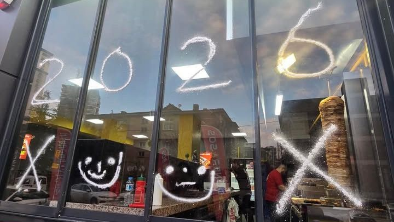 İş yerinin camına "2026" yazan işletme, 2025’e girmeden bir sonraki yılın kutlamalarına başlamasıyla hem şaşkınlık hem de tebessüm uyandırdı.