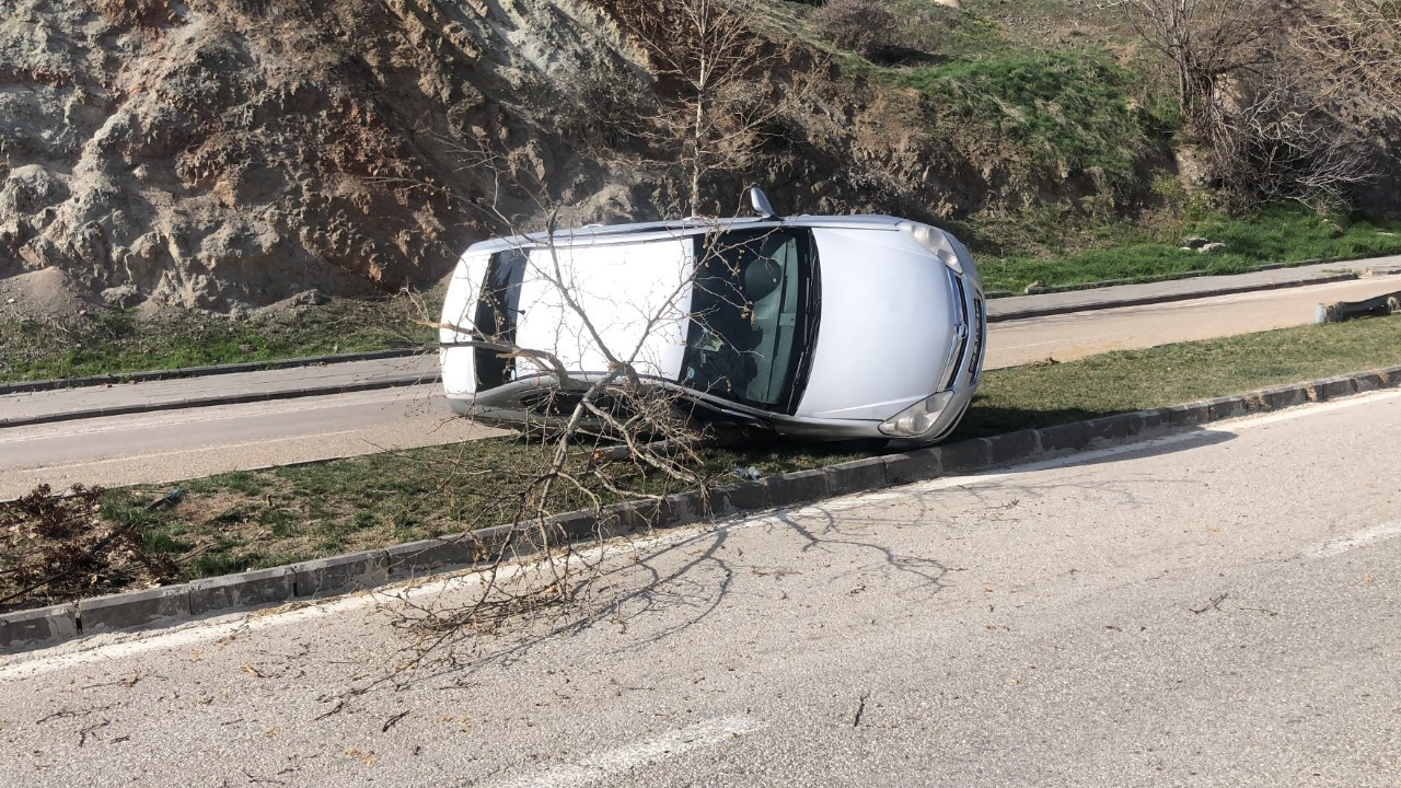 Hızla ilerleyen araç, refüjde bulunan ağaca çarparak yan yattı. Ağacın çarpma anındaki etkisiyle otomobilin takla atmasının önüne geçildi.