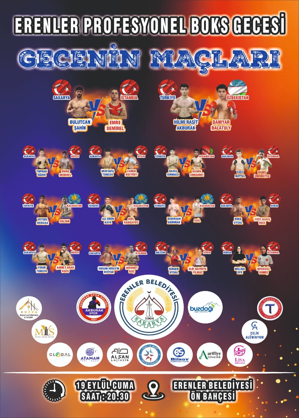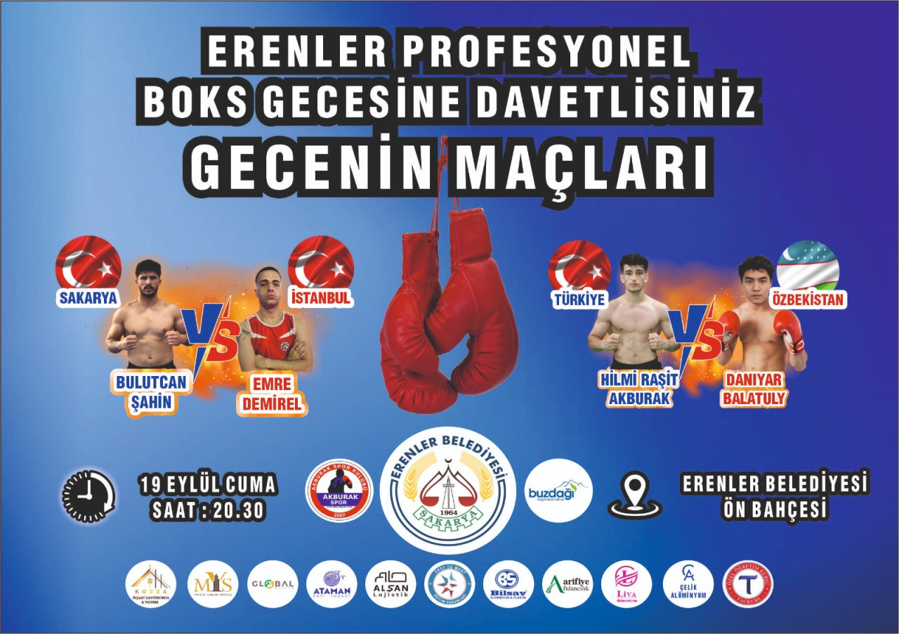 Program hakkında açıklamada bulunarak tüm vatandaşları davet eden Başkan Şenol Dinç, “Erenler Belediyesi olarak spora ve sporcuya verdiğimiz desteği her fırsatta gösteriyoruz. Bu kez de heyecan dolu bir organizasyona en sahipliği yapıyoruz. 19 Eylül Cuma akşamı düzenleyeceğimiz Boks Gecesi ile hem gençlerimizin hem de hemşehrilerimizin unutulmaz bir akşam geçirmesini sağlayacağız” dedi.