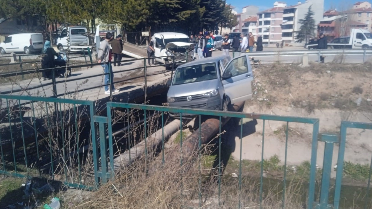 Eskişehir’de iki aracın kafa kafaya çarpıştığı kazada büyük bir faciadan dönüldü. Çarpışma sonrası panelvan araç su kanalı üzerindeki boruların üstünde asılı kaldı. Neyse ki kazada ölen ya da yaralanan olmadı.