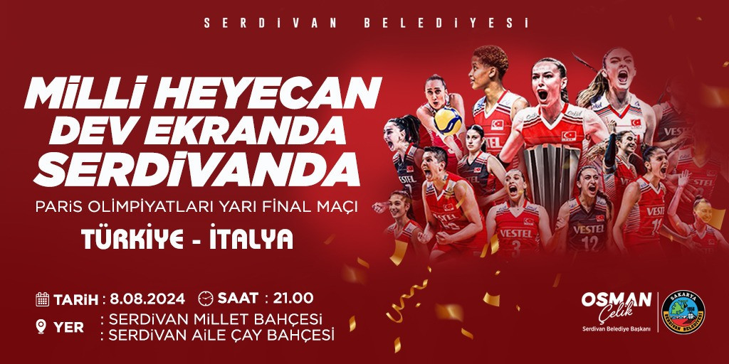 Başkan Çelik, sosyal medya paylaşımında şu ifadelere yer verdi: "Haydi Serdivan! Paris 2024 Olimpiyat Oyunları'nda yarı finale yükselen A Milli Kadın Voleybol Takımımızın yanındayız. Türkiye-İtalya maçında #FileninSultanlarına destek olmak için Serdivan Millet Bahçesi ve Serdivan Aile Çay Bahçesi'ne milli maç heyecanımızı hep birlikte yaşamaya davetlisiniz."