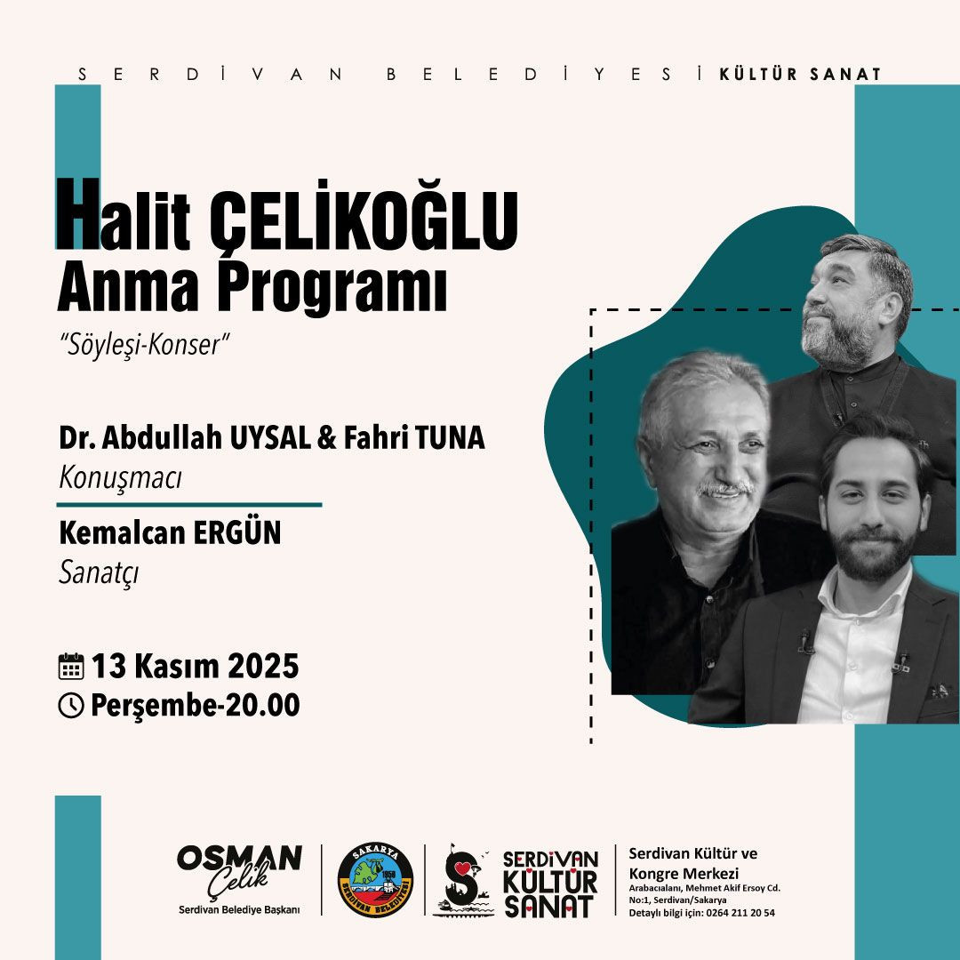 Sanatçının zengin edebi ve müzikal mirasını onurlandırmak amacıyla düzenlenen etkinlik, 13 Kasım Perşembe günü saat 20:00’da Serdivan Belediyesi Kültür ve Kongre Merkezi’nde gerçekleştirilecek. Programın ilk bölümünde, Halit Çelikoğlu'nun hayatı ve sanatı, Araştırmacı Yazar Fahri Tuna ve Abdullah Uysal'ın katıldığı bir söyleşi ile mercek altına alınacak. Etkinliğe sanatçının eşi Gülay Çelikoğlu ve yeğeni Nevzat Köseoğlu’u da konuk olarak katılacak.
