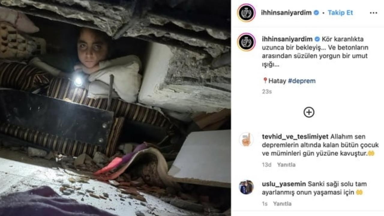 Kahramanmaraş depreminde etkilenen Hatay'da enkaz altında kalan ve elinde fenerle bekleyen genç kız, İHH ekiplerinin çabalarıyla kurtarıldı.