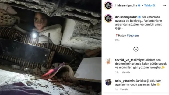 Hatay'da görevli İHH arama kurtarma ekibi, gelen bir ihbara gittikleri binada, enkaz altında fenerle etrafını aydınlatmaya çalışan bir kız çocuğunu buldu.