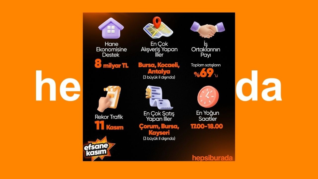 'Efsane Kasım'da Hepsiburada, indirimlerle tüketicilere 8 milyar TL'nin üzerinde tasarruf sağlarken, Türkiye'nin dört bir yanındaki 101 bini aşkın iş ortağı da ilave ciro imkanı sağladı. 11 Kasım'da en yüksek günlük sipariş sayısı ve ciro rakamına ulaşıldı. Beyaz eşya paketi, halı yıkama makinesi ve altın geçtiğimiz yıla göre satışlarını en çok artıran ürünler olurken; küçük ev aletleri, süpermarket, moda ve kozmetik ise en çok talep gören kategoriler olarak dikkat çekti.