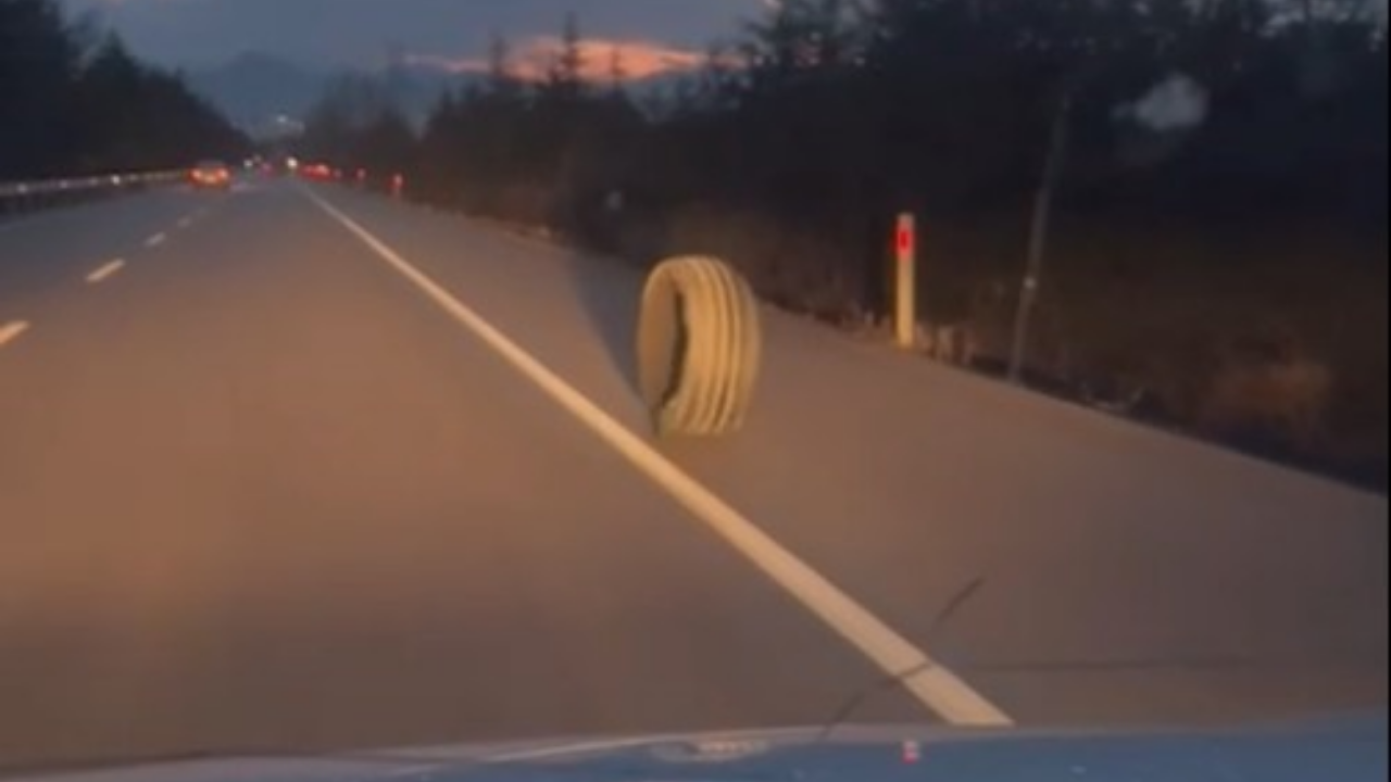 Lastiğin yolda ilerlediği anlar, trafikteki bir sürücü tarafından cep telefonu kamerasıyla kaydedildi.