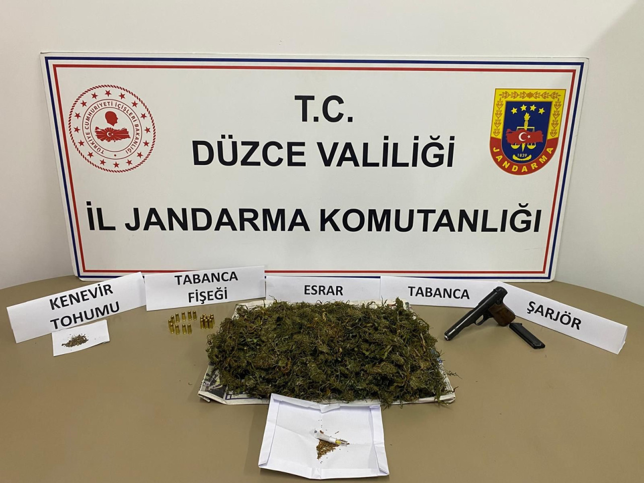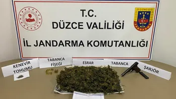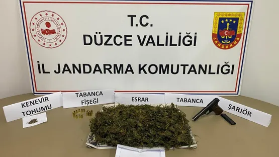 Düzce’nin Çilimli ilçesinde jandarma ekipleri tarafından yapılan çalışmada 650 gram kubar esrar, 56 adet kenevir tohumu, sarılmış 2 gram kubar esrar, tabanca ve tabancaya ait 21 adet fişek ele geçirildi.