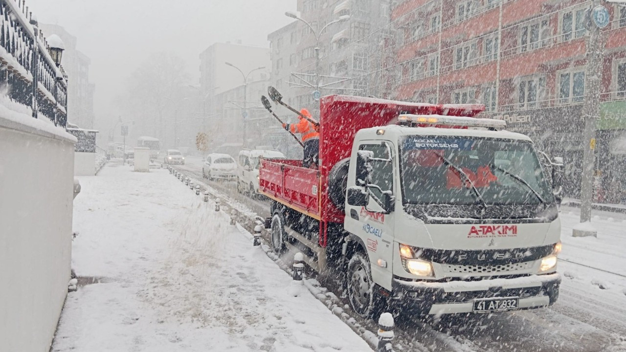 Kocaeli'de kar yağışı sebebiyle ekipler, 12 saat boyunca direksiyon başında görev yaparak yolları açıyor.