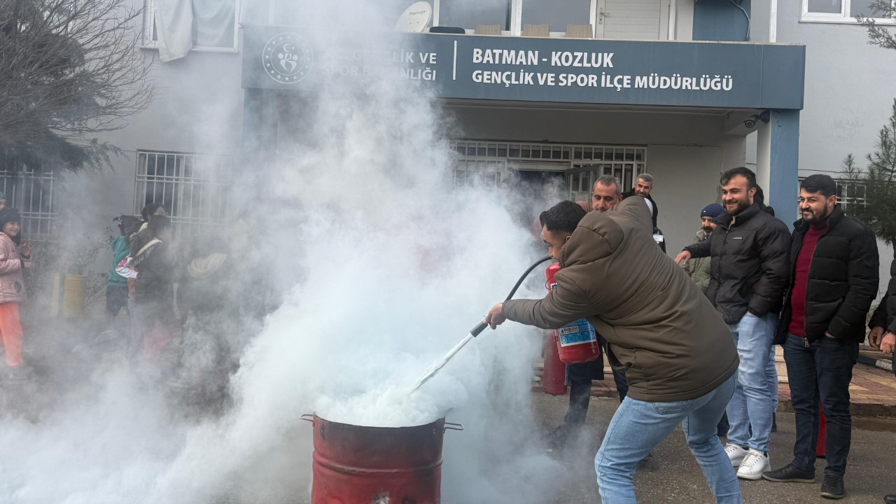Kozluk Gençlik ve Spor İlçe Müdürlüğü koordinasyonunda yapılan tatbikatta, Kozluk Belediyesi itfaiye ekipleri yangına müdahale tekniklerini uygulamalı olarak anlattı.