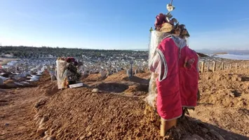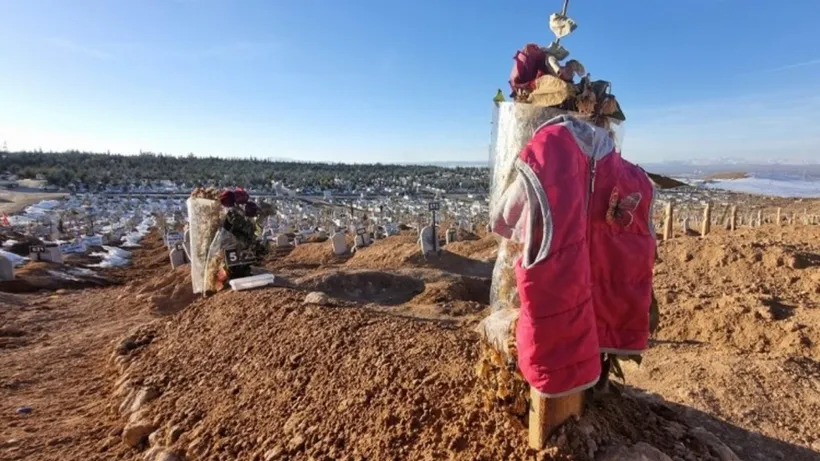 Mezar başlarına yakınları tarafından eşarp, seccade ve bere gibi özel eşyalar asıldı. Bir mezarın başında tahtaya asılan kırmızı çocuk montu ise dikkat çekti.