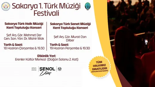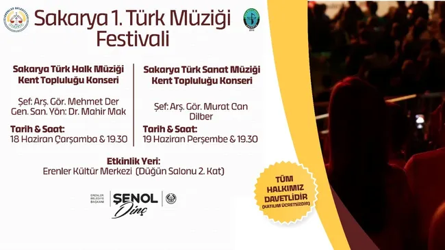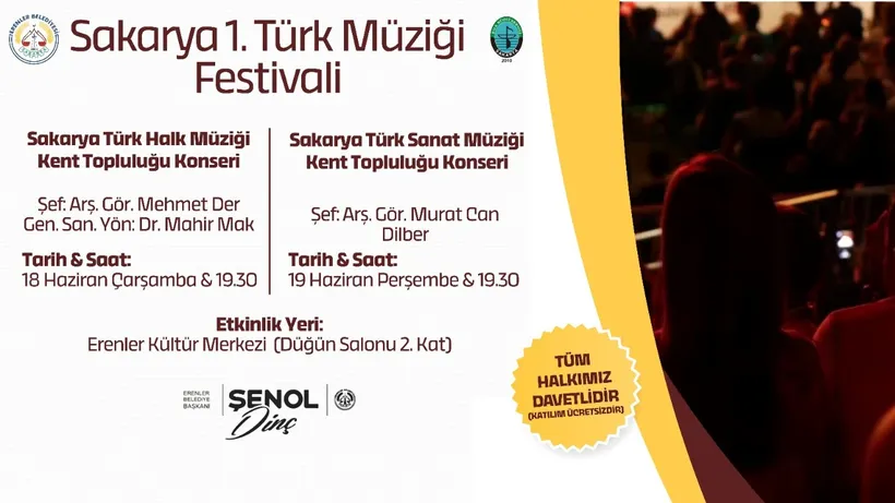 Sakarya 1. Türk Müziği Festivali’nin duyurusunu yapan Erenler Belediye Başkanı Şenol Dinç, “Erenlerimizde kültür ve sanat programlarımıza devam ediyoruz. Türk Halk Müziği ve Türk Sanat Müzikleri ile geçecek 2 programımıza tüm hemşehrilerimiz davetlidir” dedi.