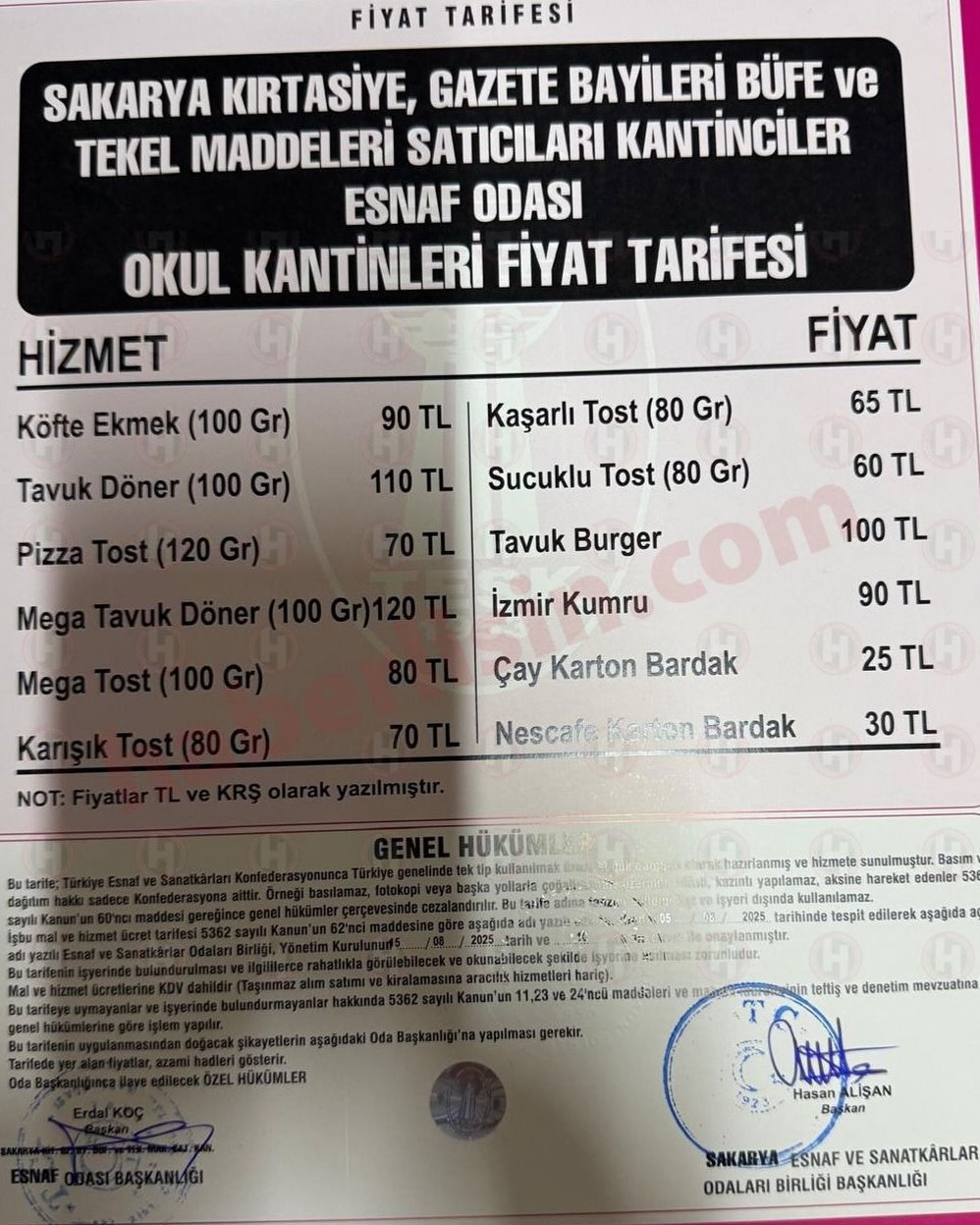 Yeni eğitim-öğretim yılı öncesi okul kantinlerinde fiyat listesi belli oldu. Bir tost ve ayranın 75 liradan satılacağı açıklandı. Oda Başkanı Erdal Koç, fiyatların enflasyona göre uygun olduğunu ancak asgari ücretli veliler için yüksek kaldığını söyledi. Kantinci esnafı ise güvenlik, kira ve prim ödemeleri nedeniyle zor günler geçiriyor.