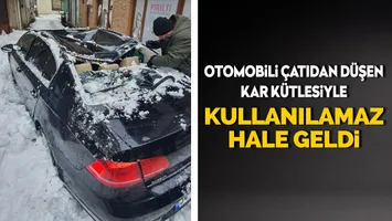 Otomobili çatıdan düşen kar kütlesiyle 1 dakika sonra kullanılamaz hale geldi