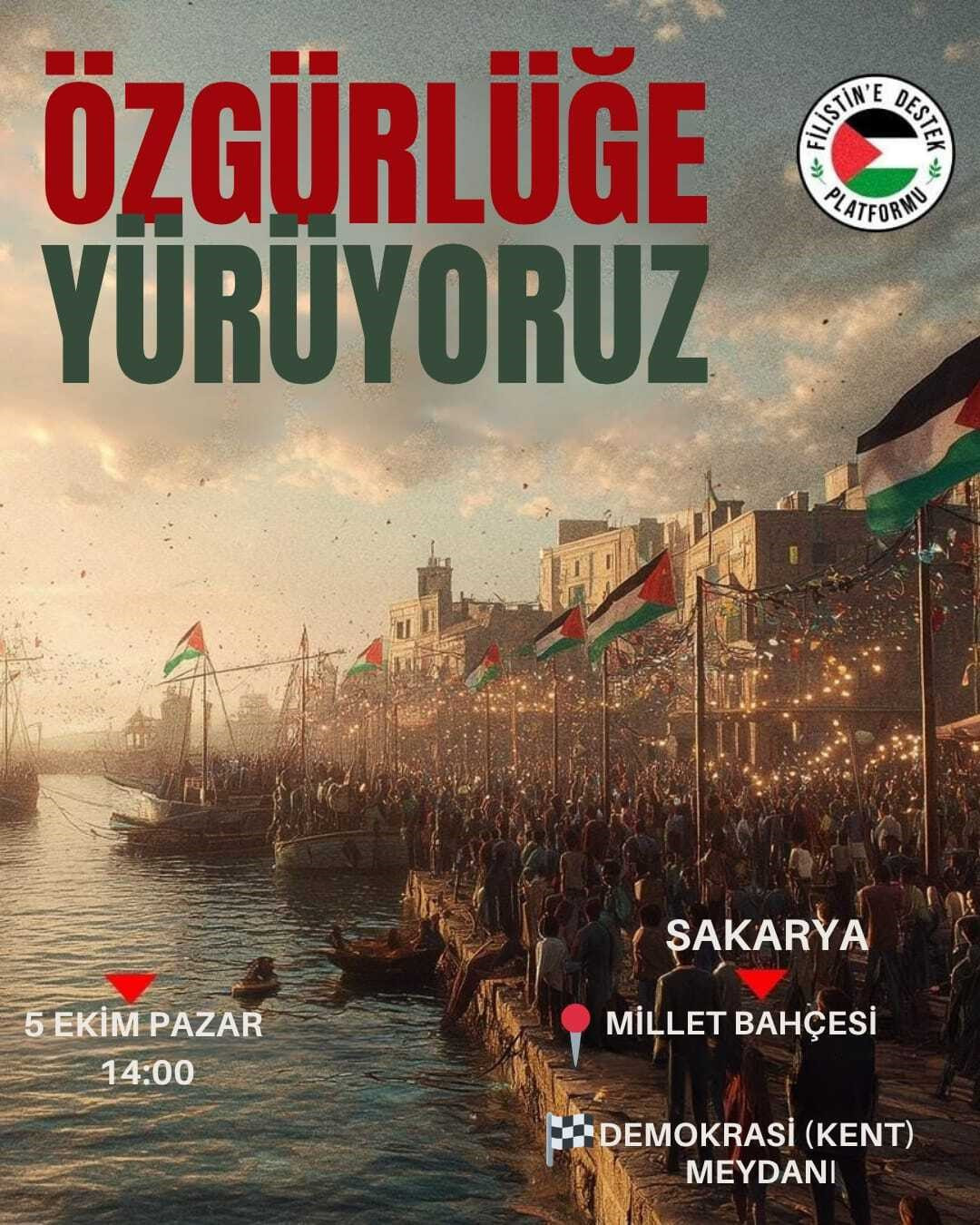 Sakarya Filistin’e Destek Platformu, İsrail’in Gazze’de gerçekleştirdiği saldırılara tepki göstermek ve mazlum Filistin halkına destek olmak amacıyla 5 Ekim Pazar günü geniş katılımlı bir yürüyüş düzenleyecek.