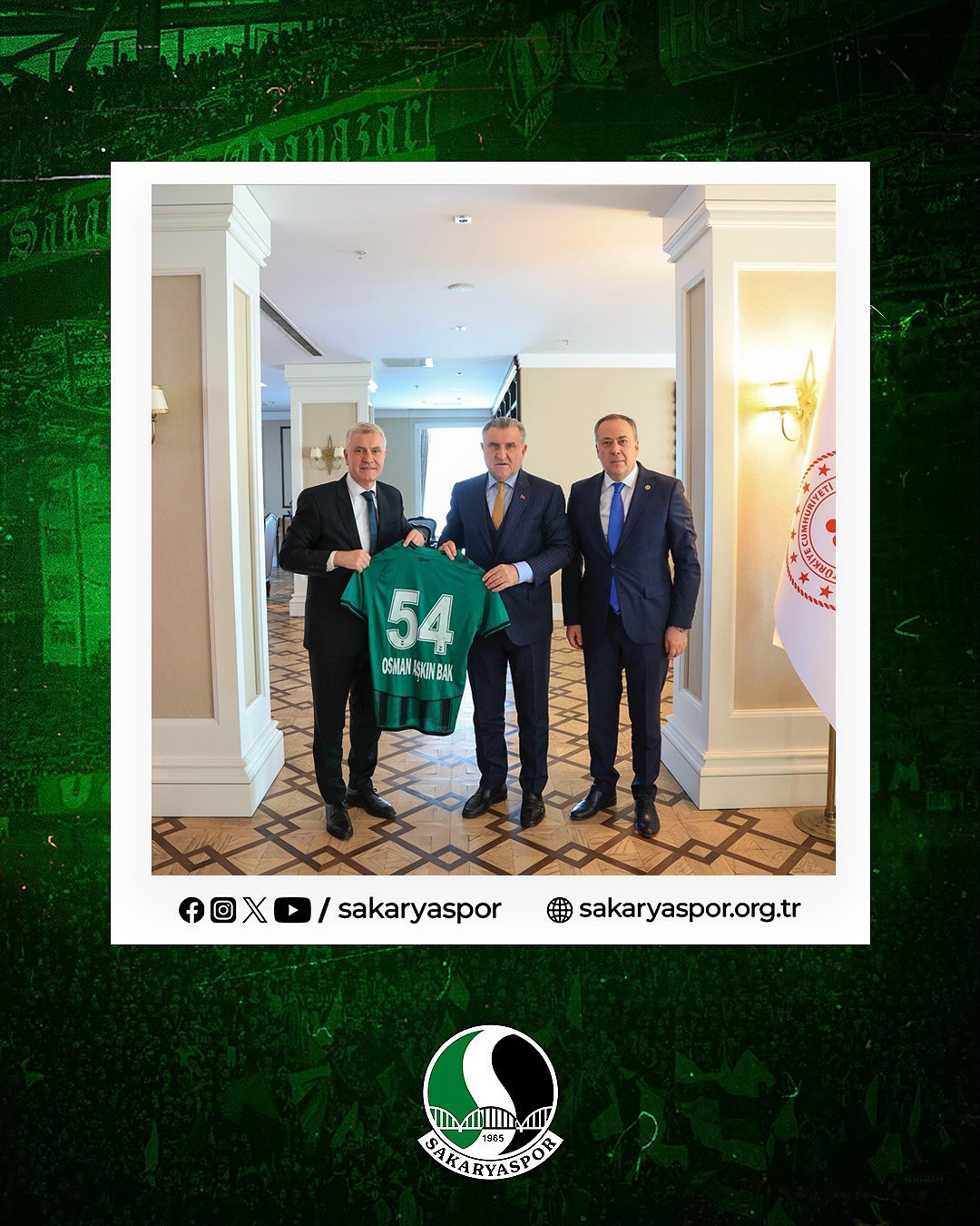 Açıklamada, "Başkanımız Muhammet Kıratlı, beraberinde Sakarya Milletvekilimiz Murat Kaya ile birlikte Gençlik ve Spor Bakanı Sayın Osman Aşkın Bak’ı ziyaret etti. Ziyarette Sayın Bakan’a Sakaryaspor tesislerimizin yenilenmesi ilgili dosya sunularak bilgi verildi ve şanlı formamız kendisine hediye edildi" ifadelerine yer verildi.