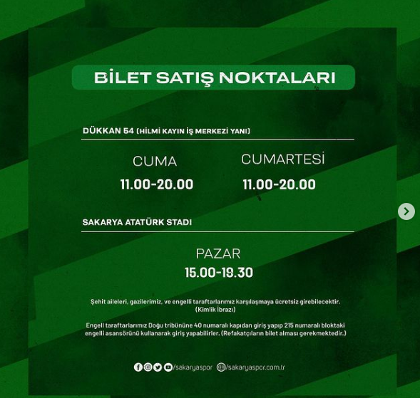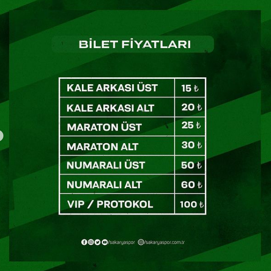 Sakaryaspor'un 12 Eylül Pazar günü kendi evinde oynayacağı Sarıyer maçının bilet fiyatları belli oldu. Biletler Cuma ve Cumartesi günleri şehir merkezinde, maç günü ise statta satılacak.