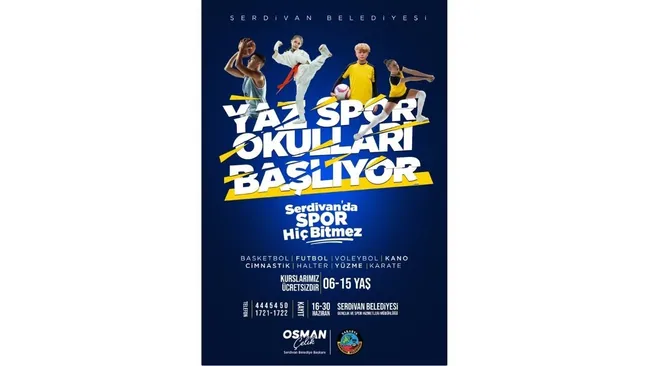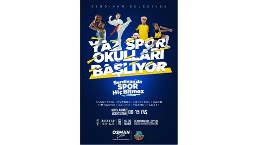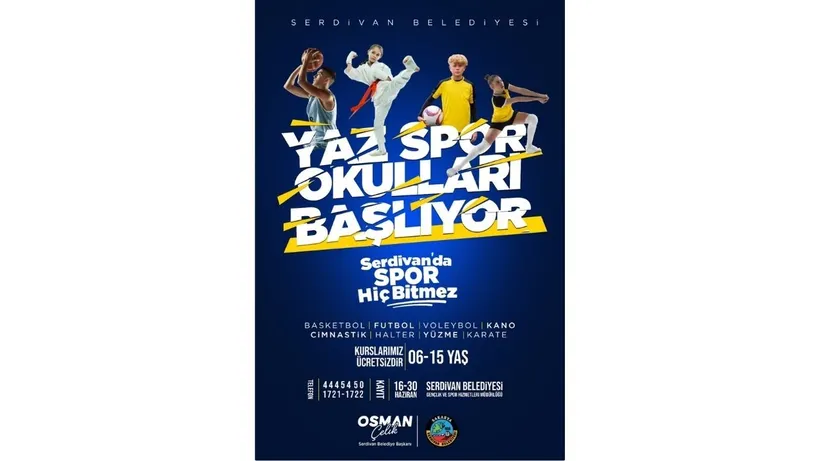 Kayıtlar, 16-30 Haziran tarihleri arasında Serdivan Belediyesi Gençlik ve Spor Hizmetleri Müdürlüğü'nde yapılacak. Detaylı bilgi almak ve kayıt işlemlerini gerçekleştirmek isteyen vatandaşlar, 444 54 50 numaralı telefondan 1721-1722 dahili koduyla yetkililere ulaşabilecek. Serdivan Belediyesi, tüm çocukları sporla dolu, sağlıklı ve keyifli bir yaz mevsimi yaşamaya davet ediyor.