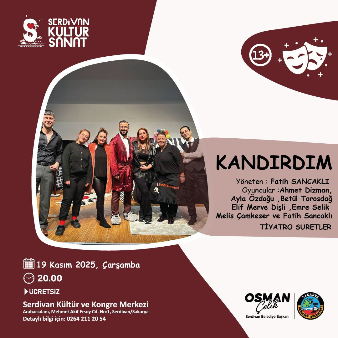 Serdivan Belediyesi Kültür ve Sanat etkinlikleri kapsamında, tiyatroseverler için kaçırılmayacak bir gösteri sahnelenmeye hazırlanıyor. "Kandırdım" adlı oyun, 19 Kasım 2025 Çarşamba günü saat 20.00'da Serdivan Belediyesi Kültür ve Kongre Merkezi'nde sanatseverlerle buluşacak.