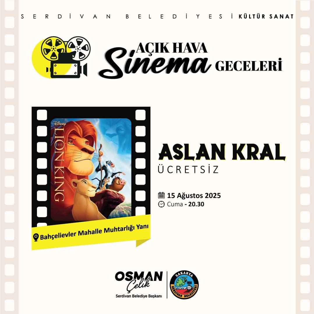 Kültür ve sanat etkinlikleri kapsamında düzenlenen Açık Hava Sinema Geceleri, 15 Ağustos 2025 Cuma akşamı unutulmaz animasyon klasiği Aslan Kral ile devam edecek. Bahçelievler Mahalle Muhtarlığı yanında gerçekleştirilecek gösterim saat 20.30’da başlayacak. Tüm vatandaşlara açık ve ücretsiz olan etkinlikte izleyiciler, açık havada film izlemenin keyfini çıkaracak.