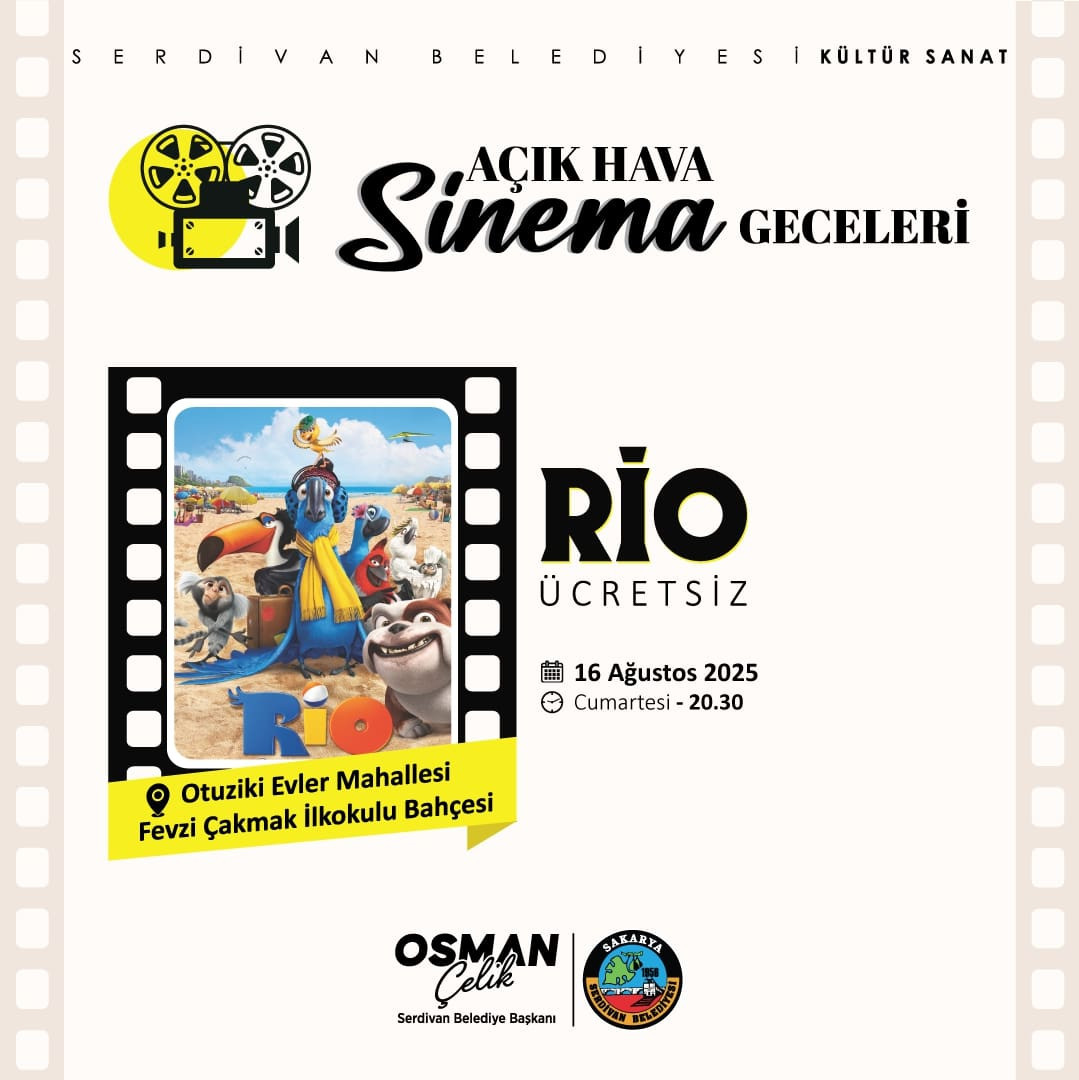 Etkinlik serisinin bir sonraki durağı ise 16 Ağustos 2025 Cumartesi günü olacak. Ailece keyifle izlenebilecek animasyon filmi Rio, saat 20.30’da Otuziki Evler Mahallesi Fevzi Çakmak İlkokulu Bahçesi’nde ücretsiz olarak sinemaseverlerin beğenisine sunulacak.