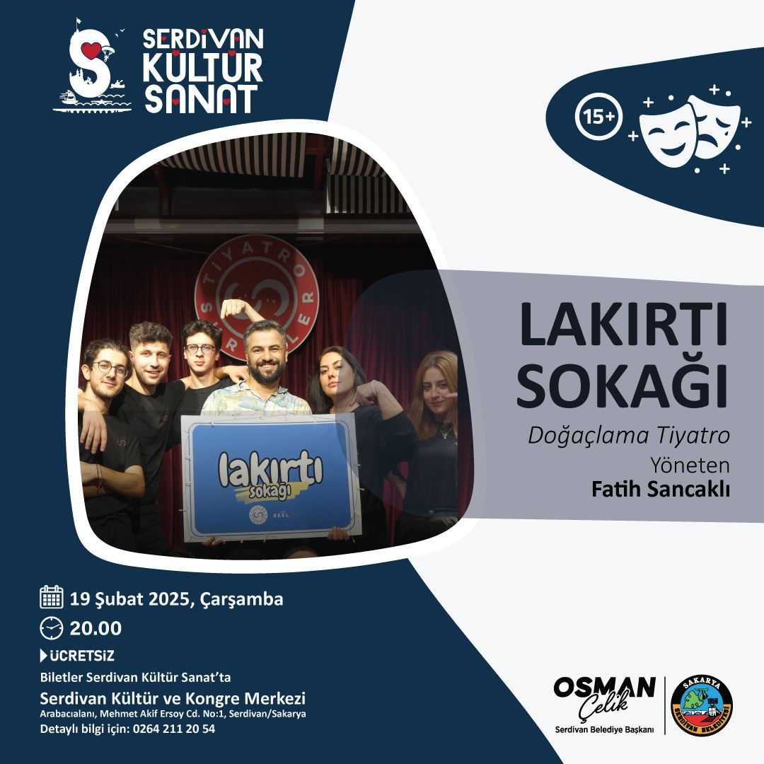 Serdivan Belediyesi tarafından düzenlenen kültür ve sanat etkinlikleri kapsamında, doğaçlama tiyatronun sevilen örneklerinden “Lakırtı Sokağı” Serdivan Belediyesi Kültür ve Kongre Merkezi’nde sanatseverlerle buluşacak. 19 Şubat Çarşamba günü saat 20.00’da sahnelenecek olan gösterinin izleyicilere eğlenceli ve keyif dolu anlar yaşatması bekleniyor.