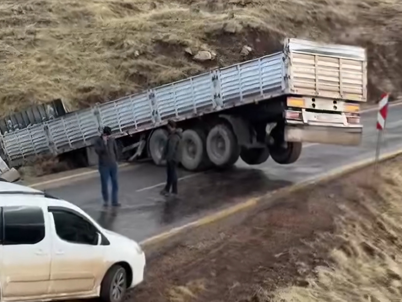 Siirt-Şırnak karayolunda yağmur nedeniyle kayganlaşan yolda kontrolden çıkan tır devrildi. Kazada yaralanan olmazken, yol yaklaşık bir saat ulaşıma kapalı kaldı.