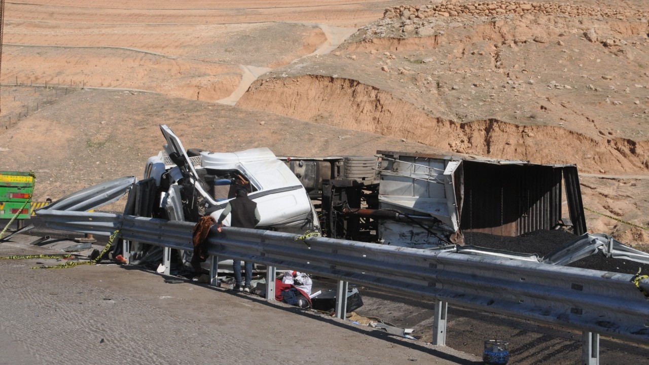 Şırnak’ın Cizre ilçesinde meydana gelen feci kazada kömür yüklü bir tır, freninin boşalması sonucu şarampole devrildi.