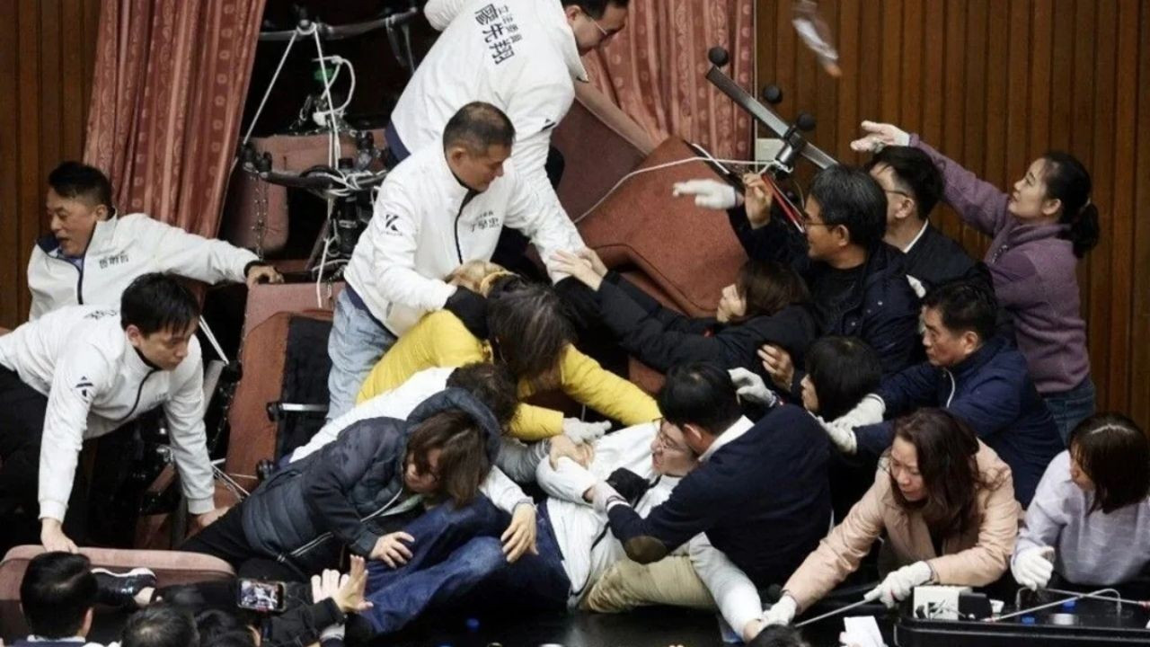Ana muhalefetteki milletvekilleri Milliyetçi Parti (Koumintang/KMT) ve muhalif Tayvan Halk Partisi (TPP) milletvekillerinin salona girmeye çalışmasıyla ortalık savaş alanına döndü.